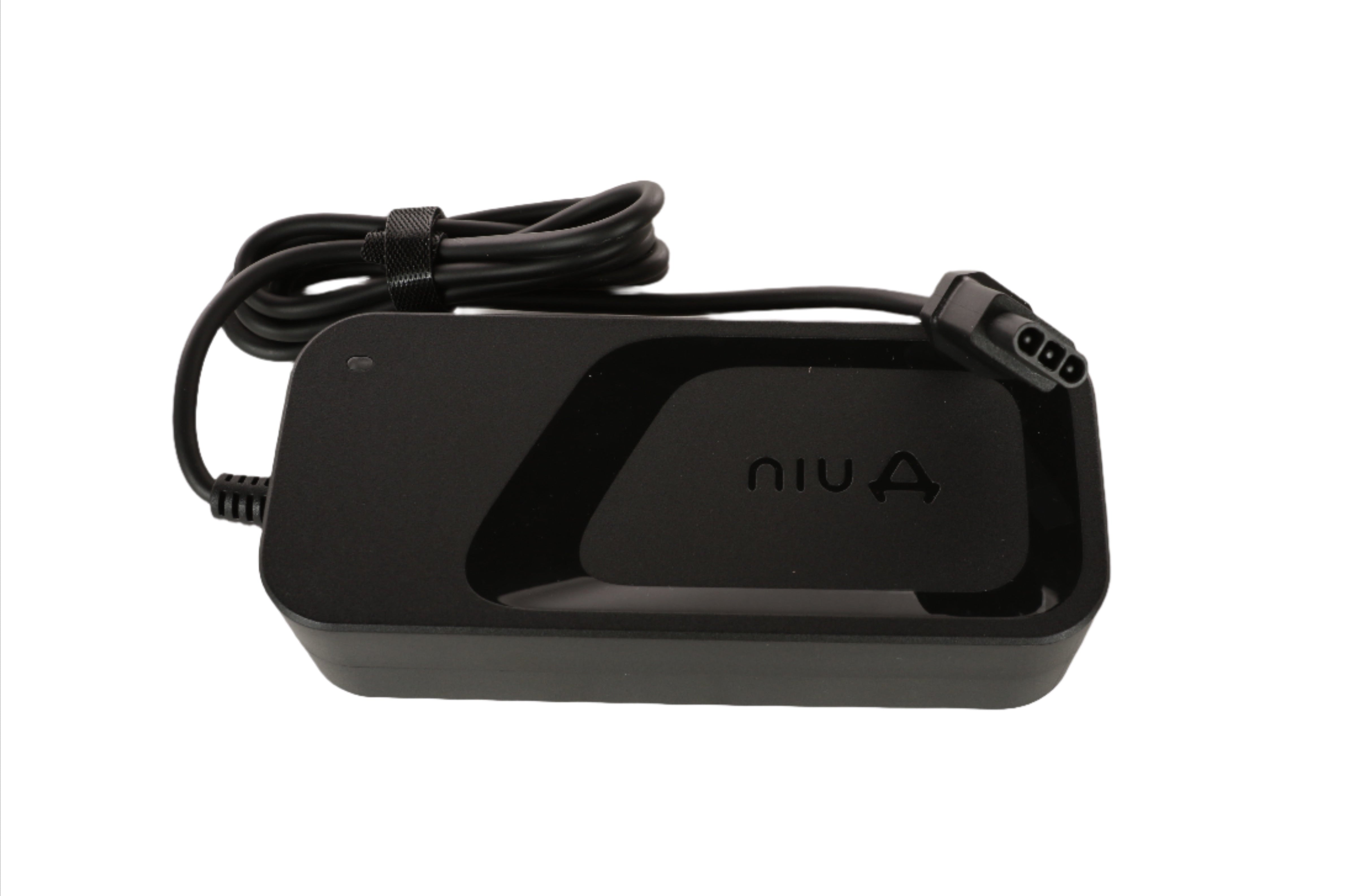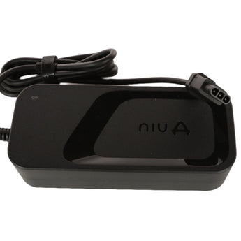 This NIU OEM standard battery charger unit is compatible with NIU KQi1 Pro and KQi1 Sport models. This product does not include the input cord, but the standard input cord is available online.